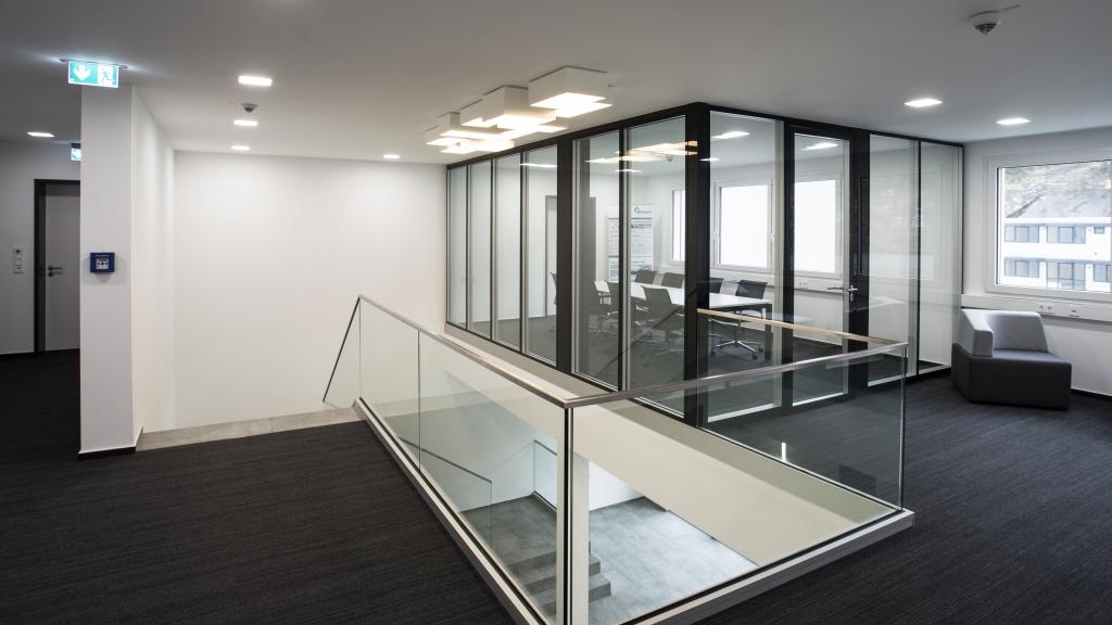 L'éclairage intérieur de l'immeuble de bureaux moderne, comme l'éclairage extérieur, a été conçu de manière cohérente en utilisant la technologie LED de fabricants renommés. Le point fort de la conception de l'éclairage est visible en particulier à l'intérieur de la zone des bureaux : les luminaires modulaires du plafond au-dessus de la cage d'escalier.