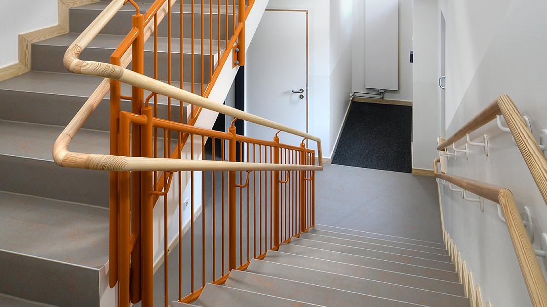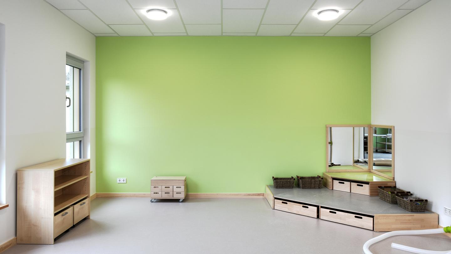 L'étage supérieur offre également aux enfants un couloir élargi comme couloir de jeu, ce qui permet la variété ainsi que la communication entre les différents groupes. Au rez-de-chaussée, il y a un local technique pour le transfert des supports pour le nouveau bâtiment, une salle de poussettes intérieure à proximité immédiate de l'entrée principale ainsi qu'une salle de poussettes accessible de l'extérieur pour les poussettes de la crèche juxtaposées.