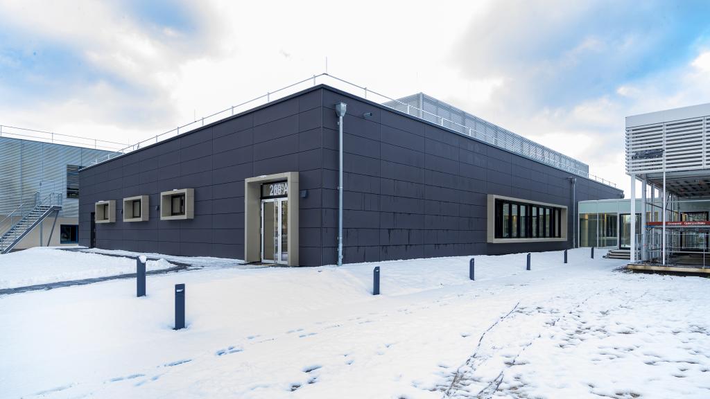 Das modulare Gebäude ist durch einen neuen Verbindungsgang an ein bereits bestehendes Kantinengebäude angebunden. Der Verbindungsgang hat eine Pfosten-Riegel-Fassade mit bodentiefer Verglasung. Um diese ansprechende transparente Optik nicht einzuschränken, ist eine Fußboden- und Deckenheizung verbaut.